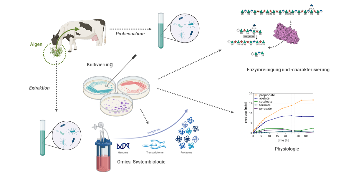 Um die Abbau- und Umwandlungswege von Algenpolysacchariden zu untersuchen, ist es wichtig, verantwortliche Mikroorganismen zu identifizieren und Einblicke in die Physiologie der Schlüsselorganismen zu gewinnen. Dafür werden Glykan-umwandelnde Mikroben aus Pansensaft von Kühen, welche mit Algenextrakten gefüttert wurden, angereichert und isoliert. Die Isolate werden mittels Omics-Analysen hinsichtlich ihres physiologischen Potenzials zur Nutzung von Algenpolysacchariden charakterisiert.